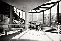 De foto toont een impressie van de inrichting van het moderne tentoonstellingsgebouw door I. M. Pei.