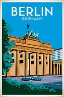 De Brandenburger Tor rijst majestueus op tegen een helderblauwe hemel, terwijl de symbolische Quadriga-beelden er trots boven troont. Retro accenten creëren een nostalgische sfeer, terwijl moderne auto's de dynamiek van de stad weerspiegelen. Een fascinerende mix van geschiedenis en hedendaags leven - Berlijn in zijn meest stijlvolle vorm!