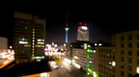 Sfeerimpressie van Berlijn bij nacht, met de Fernsehturm op Alexanderplatz centraal in beeld.