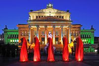 De concertzaal op de Berlijnse Gendarmenmarkt met vijf lichtgevende figuren ter gelegenheid van een lichtfestival in Berlijn.