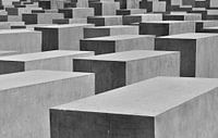 Betonnen blokken van verschillende afmetingen die de slachtoffers van de oorlog voorstellen in het Berlijnse Holocaust Memorial. Donkergrijze grafstenen in het hart van Berlijn, Duitsland.