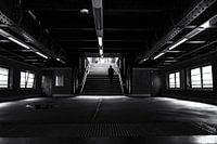 Een man loopt gehaast de trap op naar het perron van het metrostation Berlin Schönhauser Allee. Straatfotografie uit Berlijn in zwart-wit.
