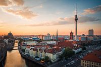Een Berlijnse skyline in het licht van de zonsondergang: een uitzicht vanaf het Fischerinsel op het Nikolai-kwartier, het rode stadhuis en de televisietoren.