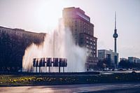 De foto toont de grote fontein op het middeneiland ("Schwebender Ring" van Fritz Kühn, 1967) en de televisietoren in tegenlicht.