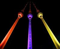 Fotomontage van drie Berlijnse televisietorens in speciale verlichting ter gelegenheid van een lichtfestival in de Duitse hoofdstad Berlijn.