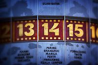 De Wereldtijdklok is een magneet voor toeristen en plaatselijke bewoners op het Alexanderplatz in Berlijn. Hij geeft al sinds 1969 de plaatselijke tijd aan. Wat hem echter bijzonder maakt, is dat hij niet alleen de plaatselijke tijd aangeeft, maar ook de tijd in alle tijdzones over de hele wereld. De foto toont een detail van de metalen rotonde met de cijfers en enkele plaatsnamen. De cirkel met cijfers draait continu rond om de juiste tijd voor elke tijdzone weer te geven. Het is ontworpen door industrieel ontwerper Erich John.