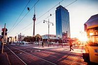Typisch Berlijn: uitzicht op de Alexanderplatz met de TV-toren en de tram in het licht van de ondergaande zon.