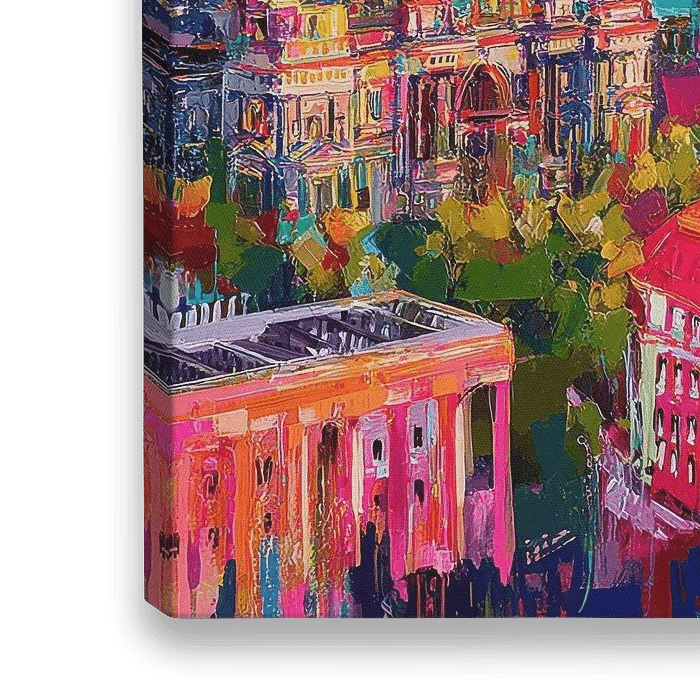 Dit levendige acrylschilderij toont de skyline van Berlijn met zijn iconische koepels en televisietoren. Brede penseelstreken en een harmonieus palet van pastelkleuren zoals roze, groen, blauw en oranje creëren dynamiek en beweging. De gereduceerde details benadrukken de kleurcompositie en geven de scène een modern, impressionistisch…