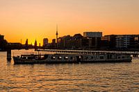 Zonsondergang achter de Berlijnse skyline. Gezien vanuit het oude Osthafen, vandaag de dag een moderne kantoorwijk. Op de voorgrond het half verzonken scheepswrak van de " Dr. Ingrid Wengler" sinds de DDR-tijden.