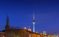 De Berlijnse skyline met de torenspits van de Nikolaikirche (links), de toren van het Rotes Rathaus en de televisietoren.
