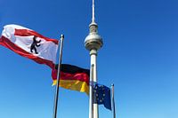 Koop de foto Berlijnse televisietoren met vlaggen van Frank Herrmann als print op canvas, aluminium dibond, (ingelijste) fotoprint, behang en ArtFrame. Voor jou op maat geprint in Fine-Art kwaliteit.
