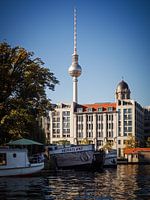 Eine Impression vom Historischen Hafen in Berlin, mit einem Blick über die Spree und die Mühlendammschleuse auf den Fernsehturm.
