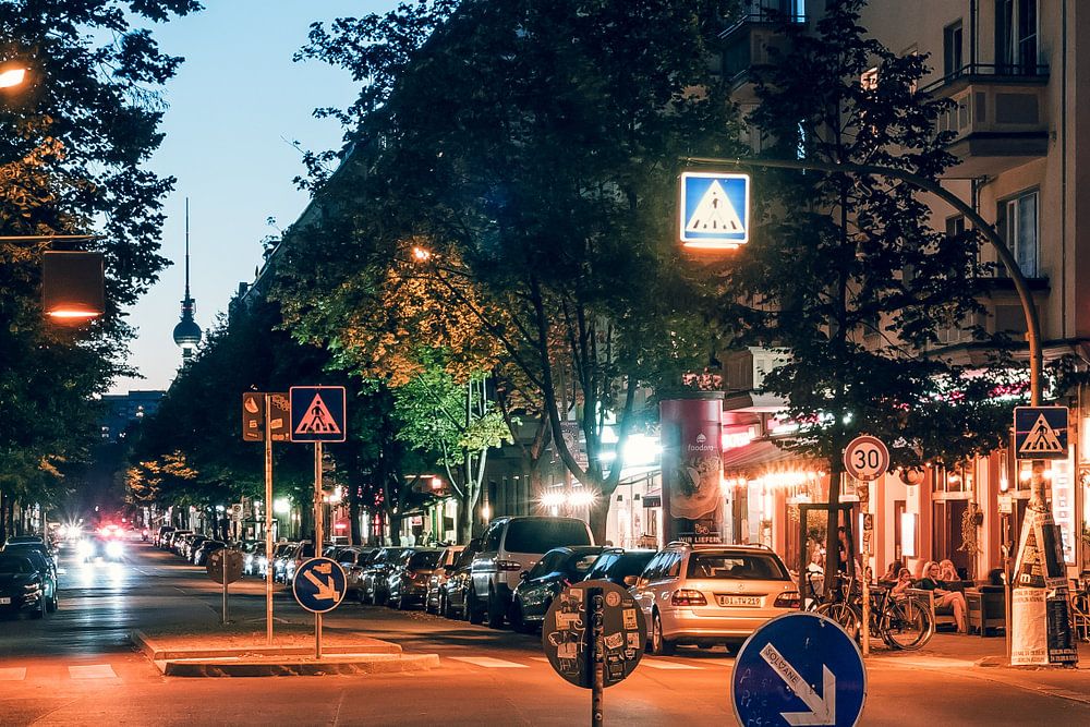 Blaue Stunde in Berlin, eine Impression aus dem Friedrichshain: Die Grünberger Strasse, Ecke Simon-Dach-Strasse.