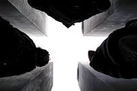 Een blik omhoog tussen de pilaren van het Holocaust Memorial in Berlijn.