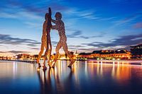 Ein Berliner Wahrzeichen im Licht der Blauen Stunde: Die Skulptur Molecule Man in der Spree, ein Werk des amerikanischen Künstlers Jonathan Borofsky.