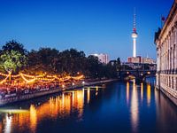 Blaue Stunde an der Berliner Museumsinsel: Ein Blick über die Spree auf den Monbijoupark und die Strandbar Mitte.