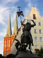 Ein Blick auf die Nikolaikirche und die St. Georg-Skulptur von August Kiss im historischen Nikolaiviertel von Berlin.