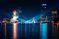 Berlin bei Nacht mit einem Feuerwerk am ehemaligen Osthafen.