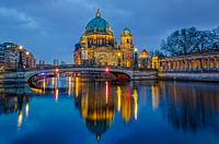 Een sfeervolle foto van de Duitse hoofdstad Berlijn bij het vallen van de avond. We kijken uit over de Spree in de richting van het museumeiland,met midden in beeld de Berliner Dom, daarvoor de Friedrichsbrücke en rechts een stukje van de Alte Nationalgalerie.