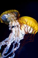 Pacifische kompaskwallen (Chrysaora fuscescens) in een aquarium.