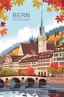 Een schilderachtig stadslandschap ontvouwt zich voor je ogen, waar glooiende heuvels in herfstkleuren oplichten. De majestueuze klokkentoren met zijn puntdak torent boven de charmante huizen uit, terwijl de kalme rivier het harmonieuze landschap weerspiegelt. Bern, een plaats vol geschiedenis en schoonheid, betovert elke toeschouwer met zijn unieke charme.