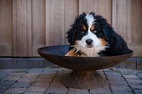 Schattig Berner Sennen puppy die heerlijk in een vuurkorf ligt waar ze nog makkelijk in past.