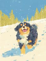 De puppy lijkt te rennen of te spelen in een besneeuwd landschap. De sneeuw is afgebeeld in verschillende tinten gebroken wit en lichtbeige, met op sommige plekken meer textuur om het ongelijkmatige oppervlak van de sneeuw weer te geven. Kleine vlekjes lichtblauw stellen verspreide sneeuwvlokken voor.
