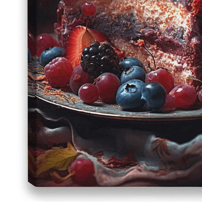 Berry Delight - Dit schilderij toont een prachtige, realistische fotografie van een heerlijke bessentaart. De kleurrijke achtergrond zorgt voor een levendige en vrolijke sfeer, terwijl de gedetailleerde portrettering van de taart en de intrigerende details ervoor zorgen dat je bijna de geur van de bessen kunt ruiken. De rijke kleuren…
