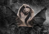 Gothic vrouw met vleermuisvleugels, emotioneel leunend tegen de muur. Ze is beschadigd.