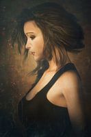 "Beschadigd": In dit aangrijpende kunstwerk staat een treurige jonge vrouw centraal. Haar blik is doorzichtig en vol verdriet, waardoor de pijn diep in haar ogen te lezen is.