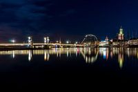 De historische Hanzestad Kampen aan de rivier de IJssel in Nederland. Het monumentale stadsgezicht spiegelt in het stromende water met zijn Stadsbrug, zeilboten en torens. Sfeervolle foto met avondfotografie