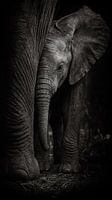 Een jong olifantje schuilt teder tussen de machtige poten van zijn moeder. Het zachte licht onthult de prachtige textuur van hun huid, de verweerde rimpels en het contrast tussen groot en klein, sterk en kwetsbaar. In deze intieme compositie komt de essentie van moederschap in de dierenwereld tot leven: bescherming, zorg en onvoorwaardelijke liefde. De blik van het jong is vol vertrouwen — een pure emotie die de toeschouwer diep raakt.
