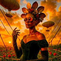 In de warme gloed van een dramatisch vlammende zonsondergang rijst een majestueuze figuur op - een samensmelting van mens, machine en mythe. Haar hoofd wordt gekroond door een imposante mechanische diadeem van bronzen bloemblaadjes en filigraan tandwielen, die de indruk wekken van een zonnebloem van de toekomst - sober, trots,…