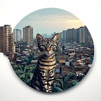 "Guardians of the City" is een boeiende mix van realisme en surrealistische charme, die de stille majesteit van een kat vastlegt tegen de achtergrond van een uitgestrekte stedelijke jungle. Dit werk spreekt tot dualiteit - gratie in chaos, natuur in beton en waakzame kalmte te midden van menselijke beweging.