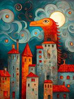 Een fantastisch stadslandschap versmelt met abstracte elementen. Een grote, surrealistische vogel torent uit boven een torenhoog gebouw. De wervelende, levendige lucht suggereert beweging en energie en contrasteert met de kalme stijfheid van de gebouwen eronder. De samensmelting van architecturale en organische vormen creëert een…