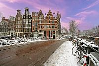 Besneeuwd Amsterdam in Nederland in de winter bij zonsondergang