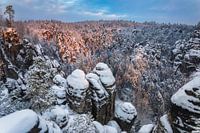 De eerste rode zonnestralen raken het besneeuwde bos en de rotsen van het Elbezandsteengebergte.