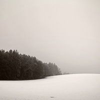 Foto van een winterse landschap met besneeuwde heuvels en bos in minimalistische stijl in zwart en wit.