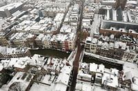 Utrecht in de winter, sneeuw bedekt de daken. Op de voorgrond zie je de Oudegracht. De Servetstraat in het midden loopt naar de Dom toe, van waar deze foto genomen is.