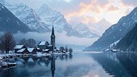 Een besneeuwd dorp met een kerk en huizen nestelt zich aan een rustig meer, perfect weerspiegeld in het stille water. Majestueuze bergen met besneeuwde toppen rijzen op in de achtergrond onder een zachte pastelkleurige hemel.