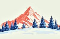 Dit besneeuwde, minimalistische berglandschap toont abstract gekleurde dennenbomen tegen een surrealistische rode piek op de achtergrond. De heldere lijnen en minimalistische vormen creëren een rustige scène die de winterse stilte van de natuur vastlegt.