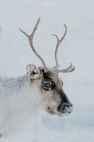 De koele wittinten met de camel tot bruine vacht van het rendier maken het een rustige kalme winterfoto.