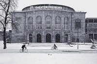 Tussen het plein van de Oude Synagoge en het theater van Freiburg sturen twee fietsers op wit parket door de vers besneeuwde binnenstad.