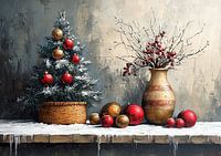 Besneeuwde Kerstballen - Dit kerst schilderij toont een sfeervolle scène met een besneeuwde kerstboom versierd met rode en gouden kerstballen, een vaas met rode bessen op takken, en een paar verspreide kerstballen op een koude, besneeuwde ondergrond, allemaal tegen een abstract grijsbruine achtergrond.