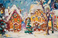 Besneeuwde Kerstdag - Dit kerstschilderij toont een levendige straatscène met kleurrijke huizen versierd met kerstverlichting en een prominente kerstboom in een besneeuwd landschap, alles weergegeven in een dikke, expressieve verfstijl.
