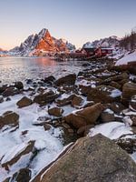 Besneeuwde bergen en bevroren fjord in het ochtendzonlicht in Reine op de Lofoten eilanden in Noorwegen in de winter