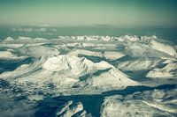 Luchtfoto van een vliegtuig dat hoog over de besneeuwde bergen in Noord-Noorwegen vliegt tijdens een mooie winterdag.