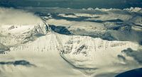 Luchtfoto vanuit een vliegtuig dat hoog over de besneeuwde bergen in Noord-Noorwegen vliegt tijdens een mooie winterdag met wolken die de bergtoppen raken.
