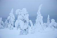 Bomen zijn bedekt met een dikke laag sneeuw en lijken op sneeuwmonsters. De foto is genomen in de winter in Finland, Lapland.