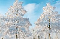 Besneeuwde winterse bomen met een prachtige blauwe lucht in de achtergrond tijdens een koude winterdag.